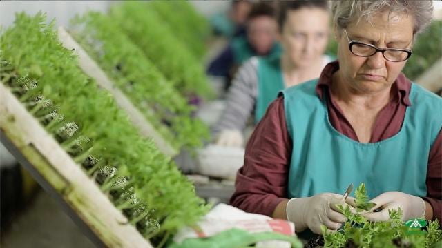 La imagen nos muestra cómo se hacen en campo los injertos naturales de dos variedades de sandías y la polinización con una tercera variedad, dando como resultado la sandía sin semillas negras.