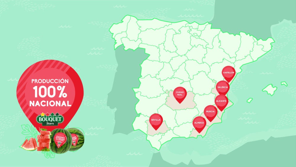 Andalucía, Murcia, Castilla La Mancha y la Comunidad Valenciana son las comunidades en las que se cultivan las sandías Bouquet. Un producto de temporada cultivado 100% nacional.