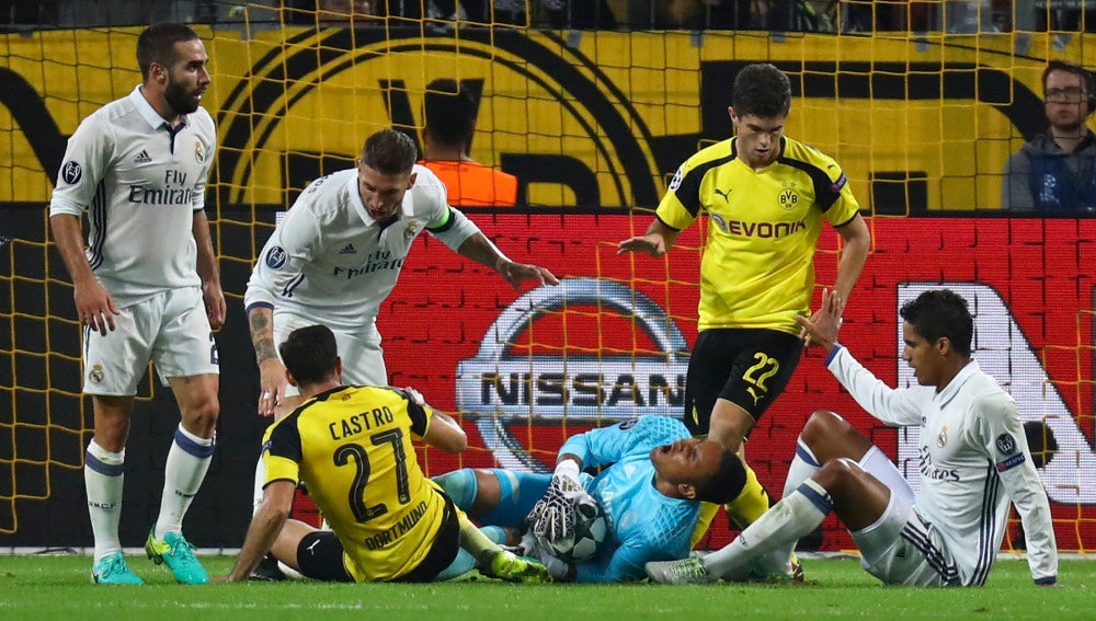Arrancó la segunda mitad y el Dortmund quiso llevar la iniciativa del ataque. Primero fue Dembelé el que intentó desequilibrar, haciéndole un '8' a Danilo y mandnado el balón fuera. Después le tocó a Aubameyang con un disparo desde la frontal que detuvo Keylor Navas. Los 10 primeros minutos fueron un suplicio para los blancos.