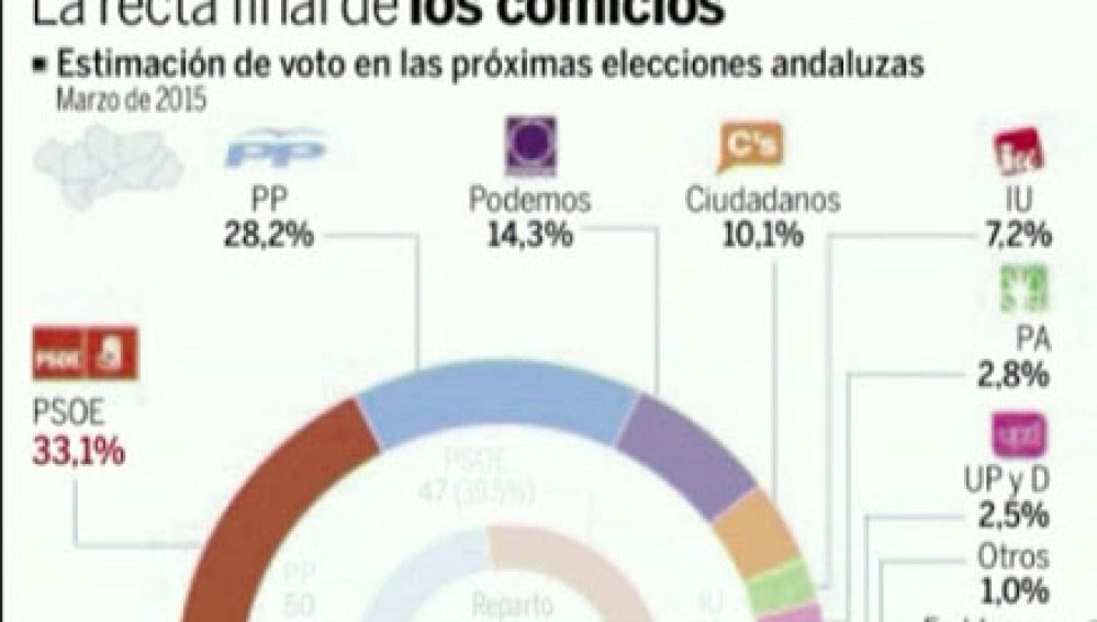 El sondeo señala que el PSOE es la formación más votada, aunque su líder, Susana Díaz, bajaría respecto a los últimos comicios regionales y se quedaría, con entre 44 y 46 escaños, lejos de la mayoría absoluta que está en los 55 diputados. La estimación del voto en esta encuesta para las principales formaciones es la siguiente: PSOE, 33,1 %; PP, 28,2 %; Podemos, 14,3 %; Ciudadanos, 10,1 %; e IU, 7,2 %.