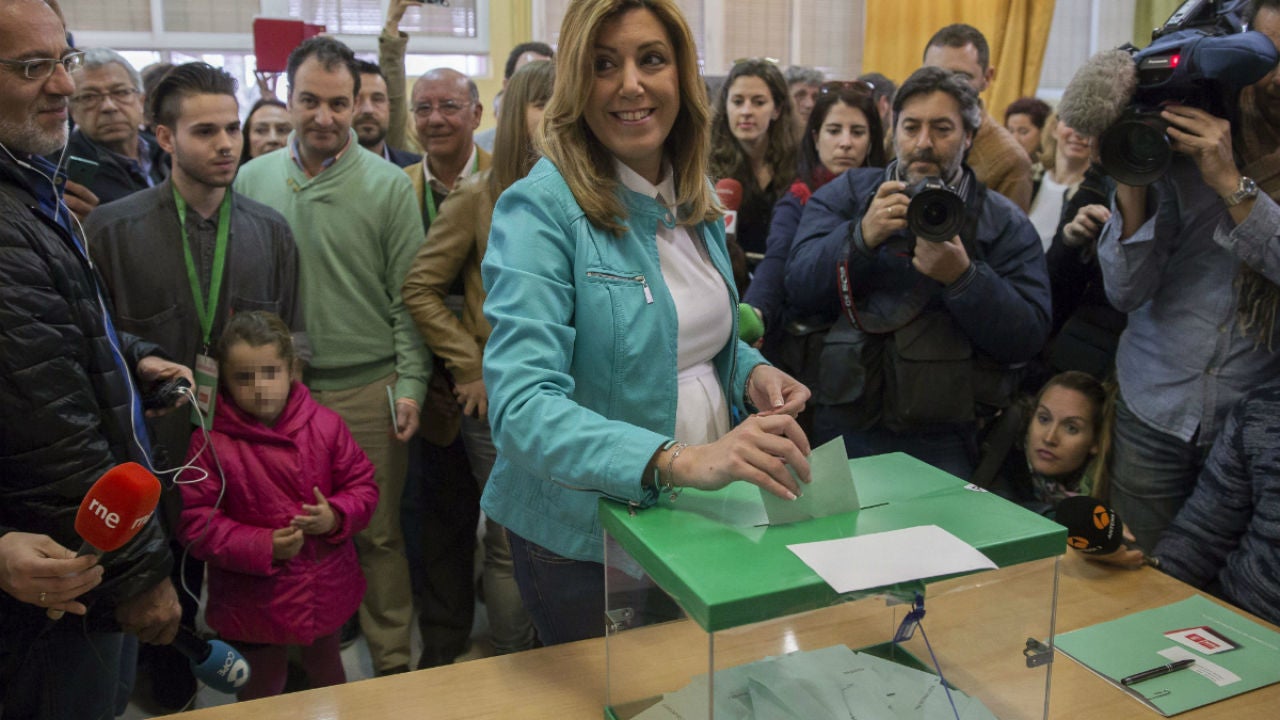 Susana Díaz ya ha depositado su correspondiente voto en las elecciones de Andalucía. La candidata del PSOE a la Presidencia de la Juta ha acudido a votar a las once de la mañana al colegio público Alfares, en el barrio sevillano de Triana, y ha estado acompañada por su marido. Ha sido ahí cuando ha aprovechado para "animar a todos los andaluces a votar este día histórico para Andalucía".