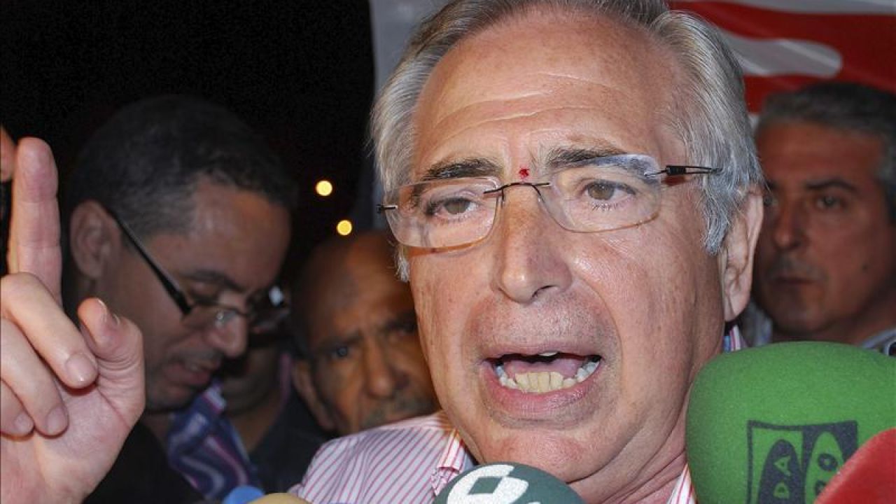 El candidato del PP a la presidencia de la ciudad autónoma de Melilla, Juan José Imbroda, sufrió una herida en el entrecejo al ser golpeado por un banderín de CPM.
