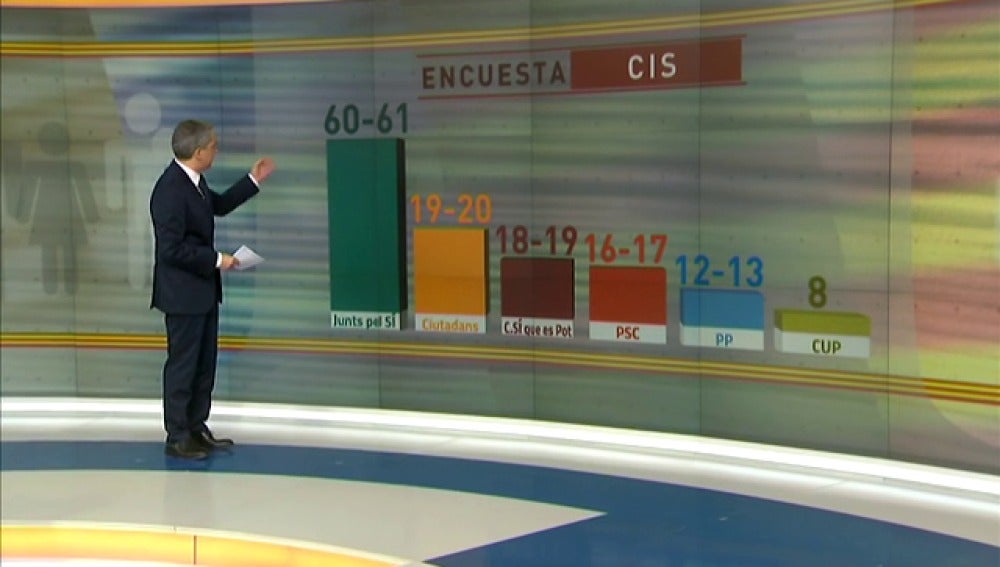 La lista independentista de Junts pel Sí, que engloba a Convergència y ERC, se quedaría a siete u ocho escaños de los 68 en los que está mayoría absoluta del Parlament catalán, una cifra que sí podría alcanzar sumando los ocho diputados que sacaría la Candidatura de d'Unitat Popular (CUP). Según el barómetro preelectoral del Centro de Investigaciones Sociológicas (CIS), la segunda fuerza más votada sería Ciutadans, que recibiría entre 19 y 20 escaños, empatada con la coalición Catalunya Sí es Pot, que se haría con con 18 o 19 representantes.