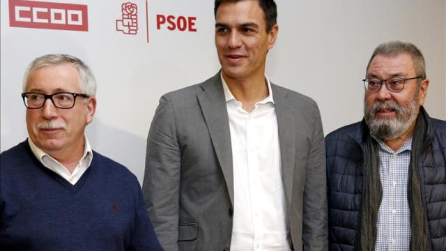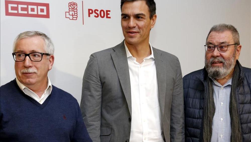 El secretario general del PSOE, Pedro Sánchez, se ha reunido con los secretarios generales de UGT, Cándido Méndez, y de CCOO, Ignacio Fernández Toxo. Tras el encuentro, el socialista ha reafirmado su postura de que, si llega al Gobierno, derogará la reforma laboral aprobada por el Gobierno del PP. En lo relativo a la indemnización del despido, no se suprimirá de inmediato y quedará a expensas del diálogo entre sindicatos y empresarios.