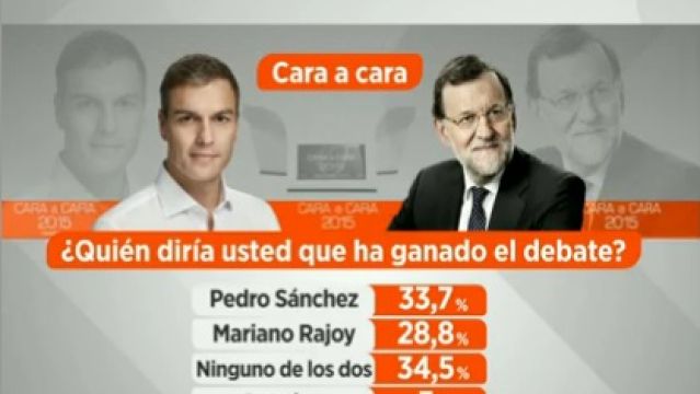 La opción 'ninguno de los dos' ha sido la más votada con el 34,5% de los encuestados con la pregunta: "¿Quién ganó el debate?", mientras que un 3% ha respondido que "los dos". El candidato del PSOE, Pedro Sánchez, fue el mejor para el 33,7%, frente al 28,8% del presidente del Gobierno, Mariano Rajoy.