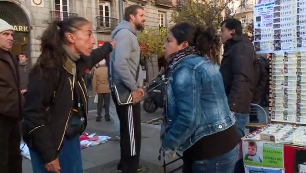 Pelean por el mejor palmo de suelo. Aún no han llegado los días fuertes de ventas… pero ya hay enfrentamientos entre las decenas de loteros ambulantes que se concentran en la Puerta del Sol.