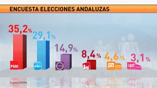 La formación de Susana Díaz obtendría el 35,2% de los votos, frente al 29,1% del PP. Podemos irrumpiría como la tercera fueza en el Palamento andaluz con el 14,9% de apoyos, según el último Estudio General de Opinión Pública de Andalucía (Egopa).