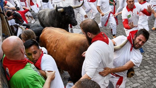 Los momentos de más tensión del octavo encierro de San Fermín con los toros de la ganadería Miura