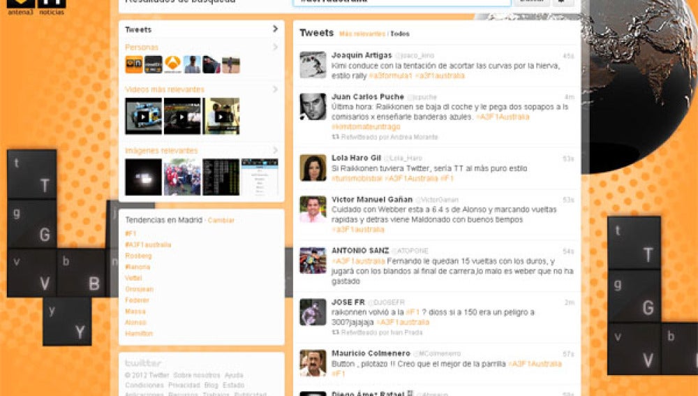 Los 'trending topic' de Twitter proclamaban a los cuatro vientos que arrancaba el primer GP de la F1. Minutos después de empezar la carrera nueve de los diez trending topic de España estaban relacionados con la competión: #F1, #A3F1Australia, #Grosjean, #Rosberg, #Los Mclaren, #Maldonado, #GP de Australia, #Vettel y #Hamilton.