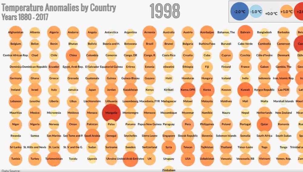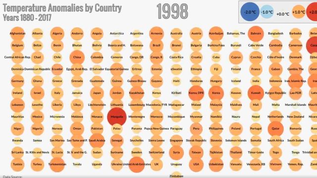 El vídeo muestra en menos de un minuto las tendencias de temperatura de 191 países en una cuadrícula en la quecada región está representado por un círculo. El tamaño del círculo indica cuánto ha cambiado la temperatura en relación con la temperatura promedio entre 1951 y 1980.