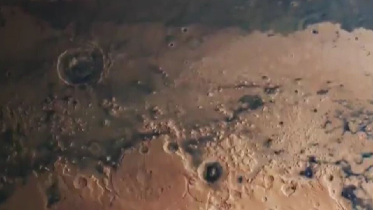 La vista del planeta está ligeramente "inclinada" hacia el sur, lo que permite ver el Polo Norte, pero solo se extiende hasta 40 grados al sur. El Polo Sur, por lo tanto, no es visible. De polo a polo, Marte mide 6.752 kilómetros; la imagen que se muestra aquí cubre poco menos de 5.000 kilómetros de esa distancia.