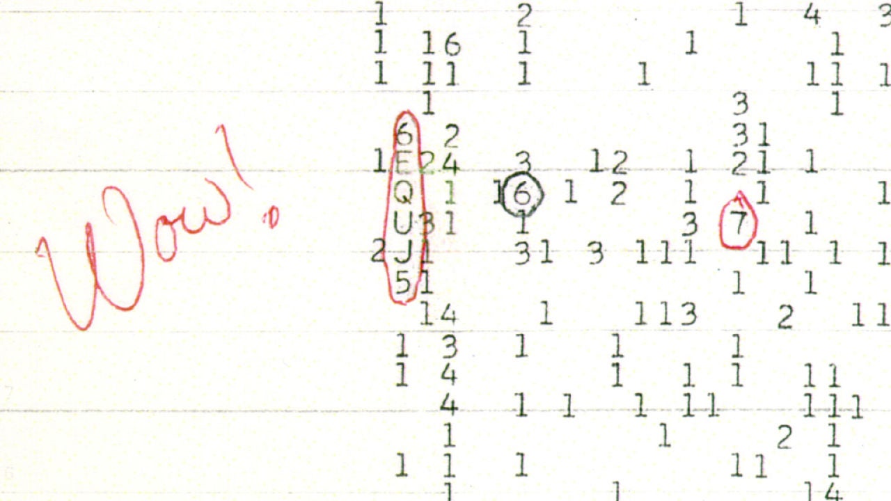 Esa noche, Ehman encontró algo. Y desde esa noche, los astrónomos han estado tratando de averiguar lo que significa. Mientras apuntaba en la dirección de tres sistemas estelares llamados Chi Sagittarii, en la constelación de Sagitario, el radiotelescopio detectó una ráfaga de ondas de radio de 72 segundos, una señal mucho más fuerte que el ruido de fondo. En la impresión del ordenador del observatorio, Ehman glosó el registro de la explosión con la anotación 'Wow!'.