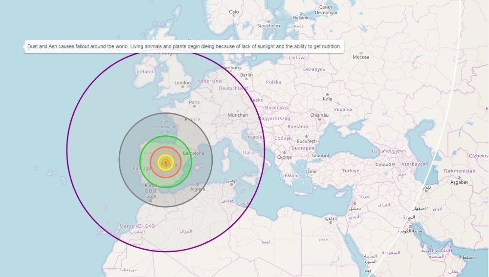 Por último, los círculos morado y gris son las zonas en las que se producirían ondas sonoras complejas y los efectos de la explosión dejarían escombros y cenizas.