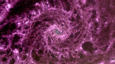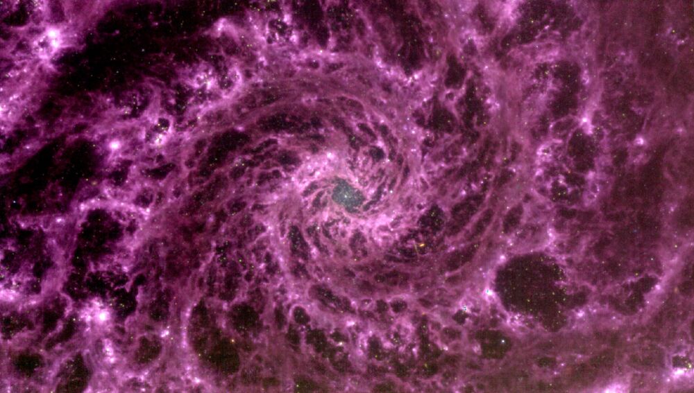 En la fotografía, se puede apreciar la increíble fotografía de la galaxia NGC 628, conocida como la Galaxia del Abanico, en forma de una espectacular espiral fucsia. Esto ha sido posible gracias al procesamiento de los tres filtros del instrumento del infrarrojo medio.