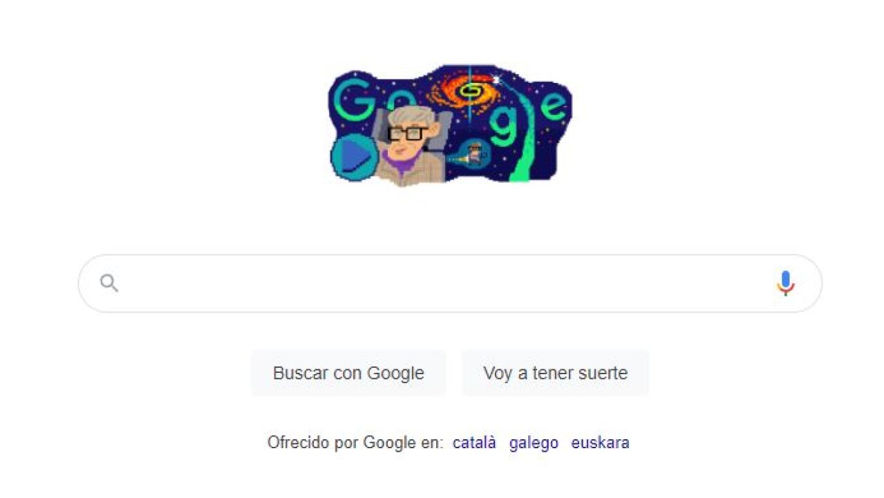 Para celebrar su nacimiento, el Google de doodle nos muestra un dibujo del científico y del universo. Al darle al 'play', nos narra la vida de Stephen Hawking, así como el propósito de sus investigaciones: comprender el universo.