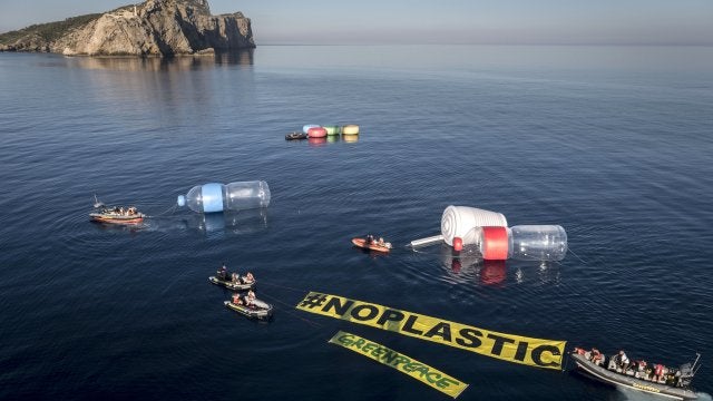 Activistas de Greenpeace han colocado este lunes 12 de junio en aguas baleares diez objetos gigantes, entre los que han destacado dos botellas de doce metros y dos vasos de seis, para visibilizar el problema de la contaminación por plásticos en los mares, y más concretamente en el Mediterráneo.
