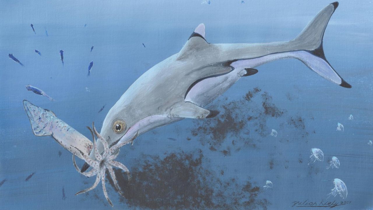 Un grupo de investigadores ha hallado, en el fósil del ictiosaurio más pequeño encontrado hasta ahora, una sorpresa: a pesar de ser un bebé recién nacido, el animal tenía el vientre repleto de los restos de un calamar prehistórico, según publica 'The Guardian'.