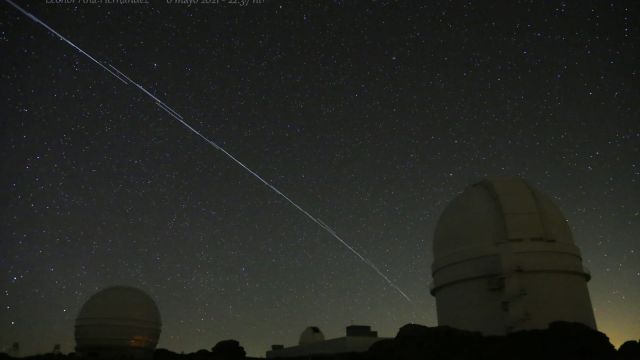 En la fotografía realizada publicada en redes sociales por Leonor Ana Hernández desde el Observatorio Astronómico de Calar Alto, en Almería, se puede ver perfectamente la línea que dibujan los satélites a su paso siguiendo la órbita.
