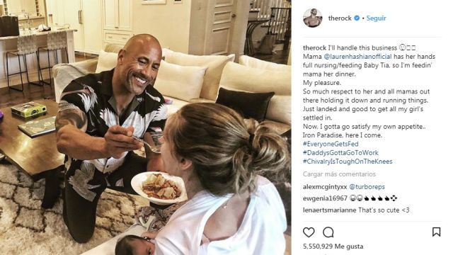 "Mamá @laurenhashianofficial tiene las manos ocupadas cuidando y alimentando a la pequeña Tia. Así que yo estoy dándole a ella de cenar. Es un placer. La respeto mucho a ella y a todas las mamás que hacen que todo funcione. Acabo de llegar y me encanta ver que mis chicas están bien. Ahora voy a satisfacer mi propio apetito...Iron Paradise, allí voy".