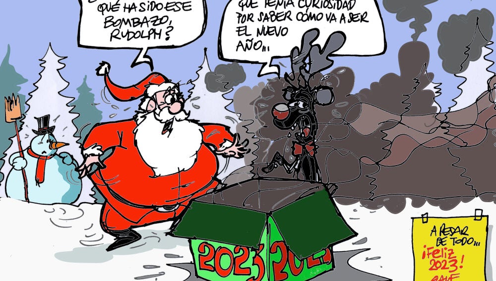 Nuestro ilustrador Alfredo Boto-Hervás ha querido felicitar el año nuevo con una de sus tradicionales viñetas. Tirando de ingenio, el periodista ha representado a Papá Noel y a su fiel escudero, el reno Rudolph, abriendo una caja.