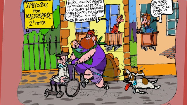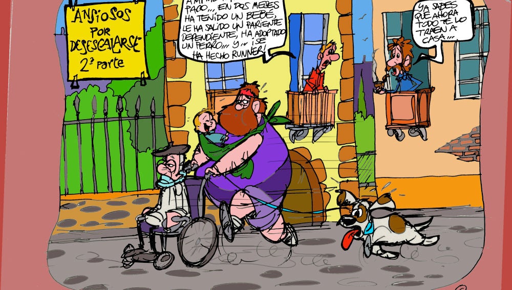 Las franjas horarias para salir a la calle durante la desescalada por coronavirus han llevado a nuestro ilustrador, Alfredo Boto-Hervás, a dibujar una viñeta en la que se aúnan todas las opciones por las que se puede salir a la calle: tener perro, tener un bebé, acompañar a un mayor dependiente y hacer ejercicio.