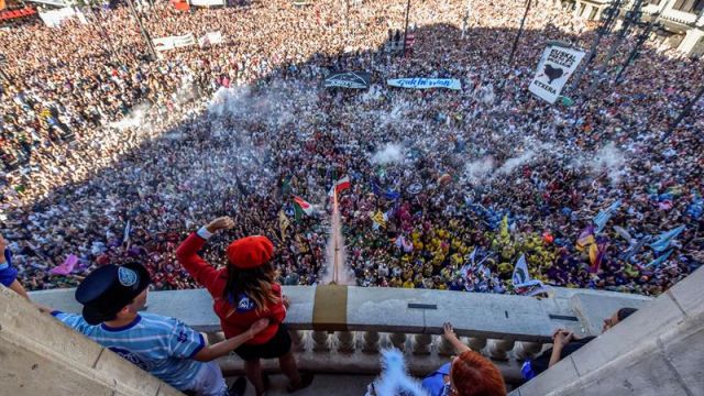 Miles de bilbaínos y visitantes han celebrado en una calurosa tarde el inicio, con el lanzamiento del txupin, del reinado de Marijaia durante la Aste Nagusia y sus nueve días de fiesta.
