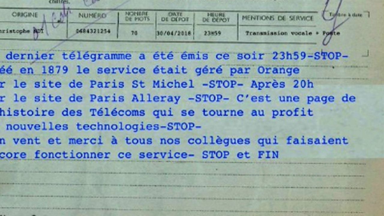 El último telegrama de Francia fue enviado este pasado lunes por la noche, según informó el operador de telecomunicaciones Orange, encargada de este servicio que existía en Francia desde 1879. "Después 139 años del primer telegrama enviado en Francia, @orange emitió el lunes 30 de abril a las 23h59 el último telegrama del Hexágono", informó en la cuenta de Twitter la compañía.