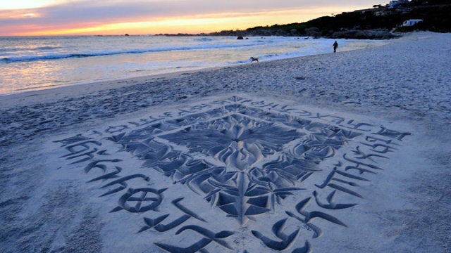 Para crear estas originales obras de arte, Andrew van der Merwe utiliza instrumentos y técnicas especiales y cava en la arena, creando las formas de las letras. Para ello, el artista ha ido desarrollando su propio estilo a lo largo de los últimos ocho años.