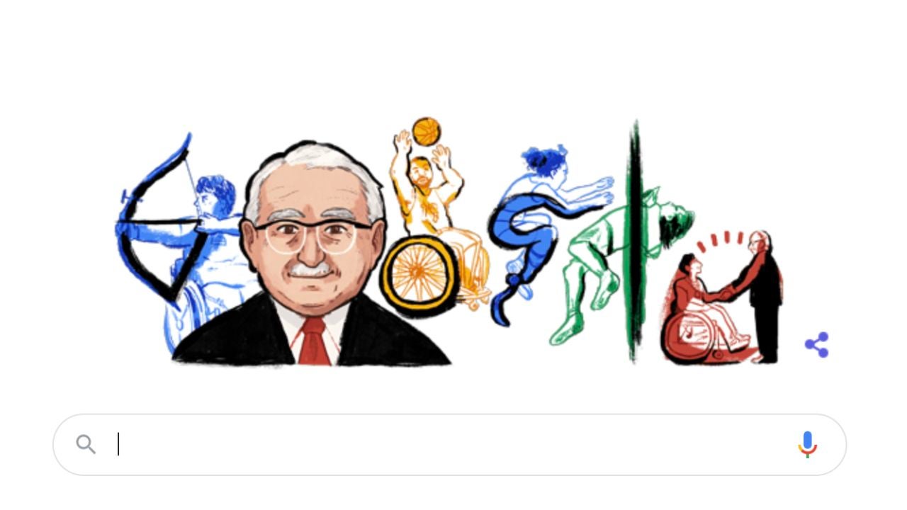 En el doodle podemos ver un dibujo del médico en primer plano. Detrás de él se ve a varias personas con discapacidad realizando diferentes deportes, mientras forman las letras del buscador Google con sus colores característicos.