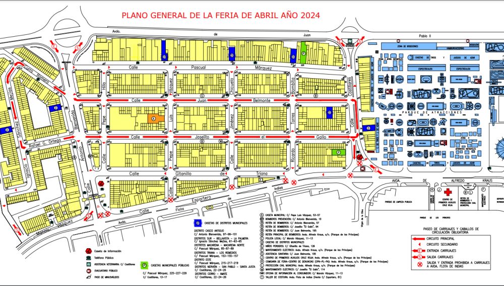 El recinto en el que se celebra la Feria de Abril se ubica entre Los Remedios y Tablada, y está dividido en tres sectores: El Real de la Feria, la Calle del Infierno y los aparcamientos.