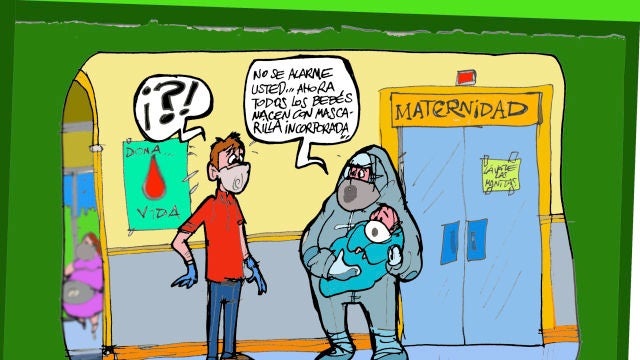 Así lo ve también nuestro ilustrador Alfredo Boto-Hervás, que las ha elegido como protagonistas de su viñeta gráfica informativa de esta semana. "Mascarillas ¿sí o sí?" se pregunta en una imagen de un bebé recién nacido...y con la mascarilla puesta. Es su forma de poner un punto de distensión en esta crisis del coronavirus que ya se alarga más de dos meses. Las fases de desescalada marcarán cuando podremos volver a una vida parecida a la de antes.