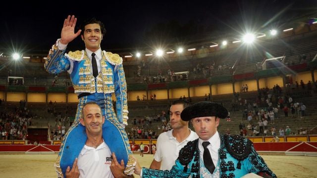 Tanto los derechazos como los naturales del mexicano estuvieron marcados por el largo trazo que recorrió el engaño y el sólido asentamiento sobre la arena del noviller, sometiendo así la fuerza del astado hasta que comenzó a pararse y a querer salirse de las suertes, momento que San Román aprovechó inteligentemente para irse a por la espada de verdad. Pero antes de la gran estocada con que lo tumbó, aún hubo tiempo para que le redondeara dos excelentes circulares invertidos, ligado el segundo a un templadísimo cambio de mano, que terminaron de ameritar las dos rotundas orejas que paseó y que le sirvieron para salir a hombros hacia el recién instalado vallado del encierro después de dejar la sensación de novillero cuajado y capaz.