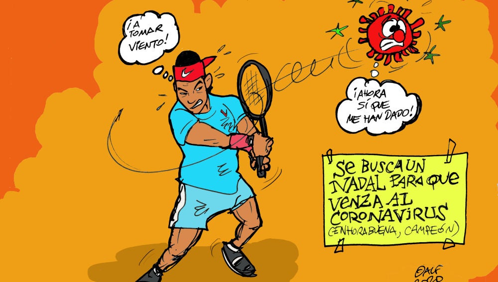 Nuestro ilustrador Alfredo Boto-Hervás se ha hecho eco de este sentir y con un toque de humor lo refleja en la viñeta gráfica de esta semana: "Se busca un Nadal que venza al coronavirus" puede leerse en la viñeta que acompaña al dibujo de Rafa Nadal que con un baquetazo logra desplazar de la actualidad informativa al coronavirus.