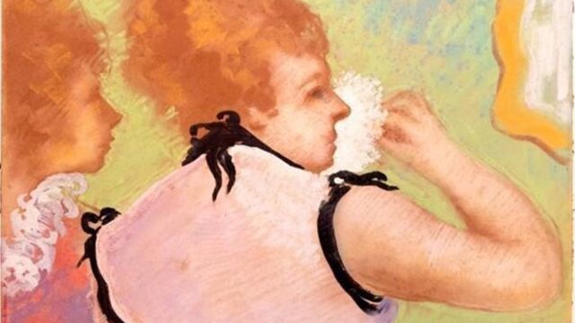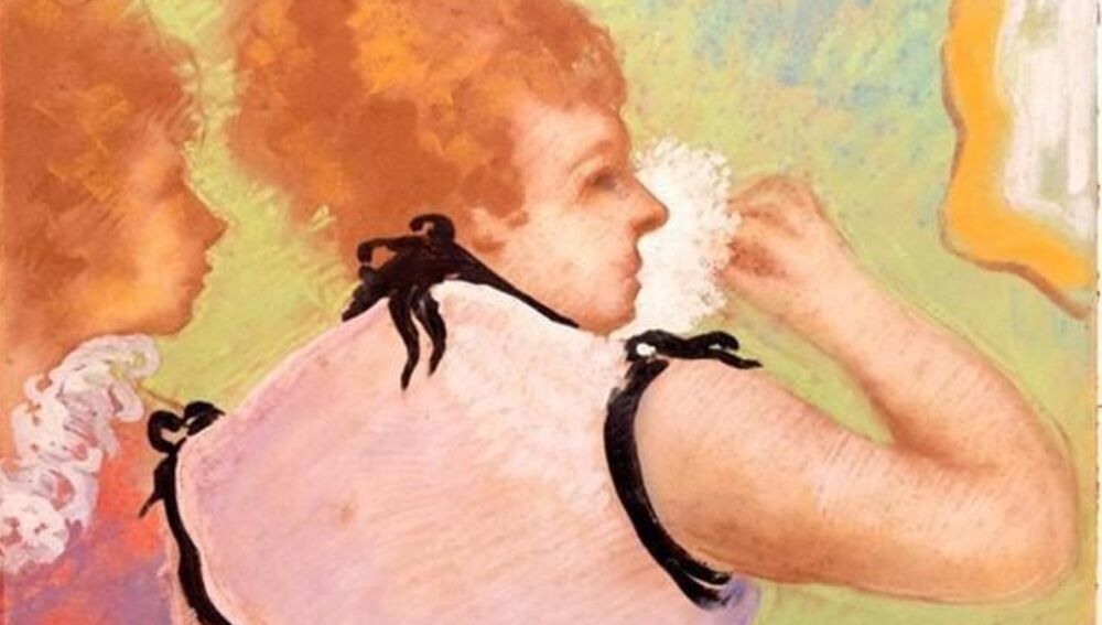 'Elogio del maquillaje' es un pastel sobre cartón con la firma del pintor francés en el margen inferior derecho. En él se ve a dos mujeres, una de ellas de perfil y la otra en el centro del cartón empolvándose la nariz.