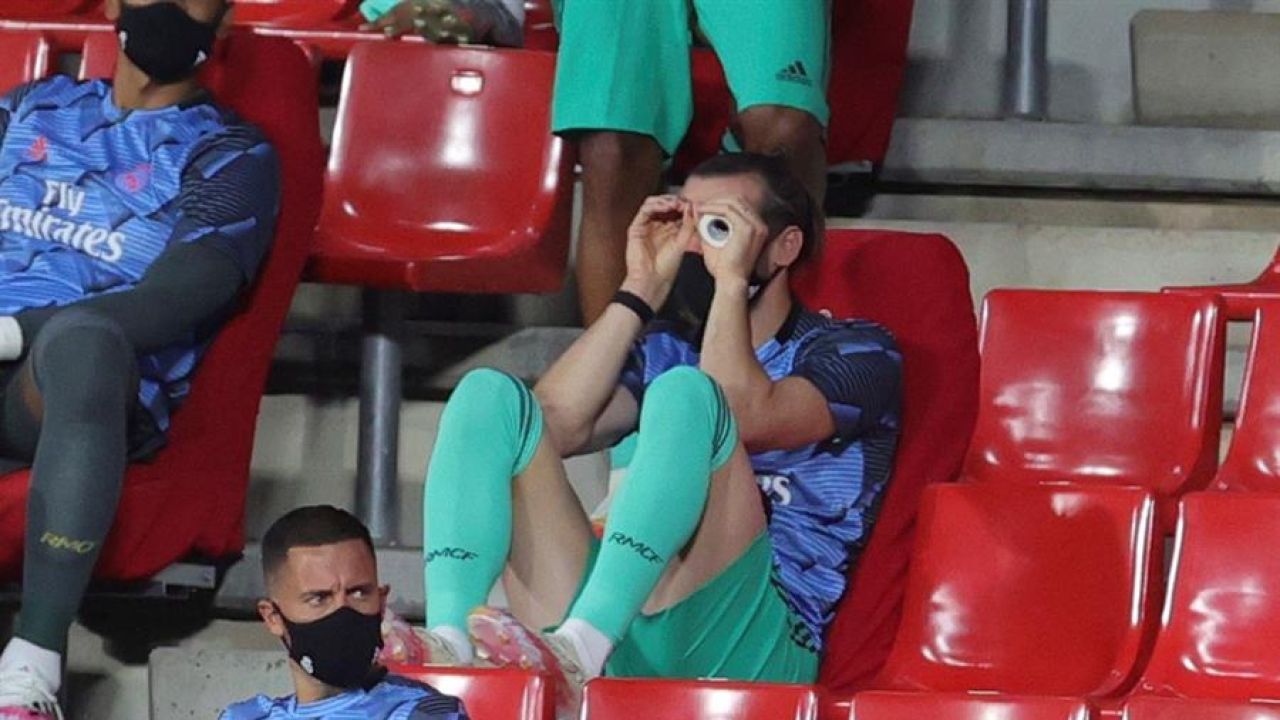 En los últimos tiempos, Gareth Bale ha sido más protagonista fuera del campo que por sus acciones sobre el césped. Su etapa, tras la vuelta del fútbol por el confinamiento, será más recordada por sus gestos en la grada que por sus goles y carreras por la banda. En la vuelta del fútbol, se le ha visto utilizar un tubo a modo de prismáticos en el encuentro frente al Granada y ponerse la mascarilla como si fuera un antifaz en el partido frente al Alavés.