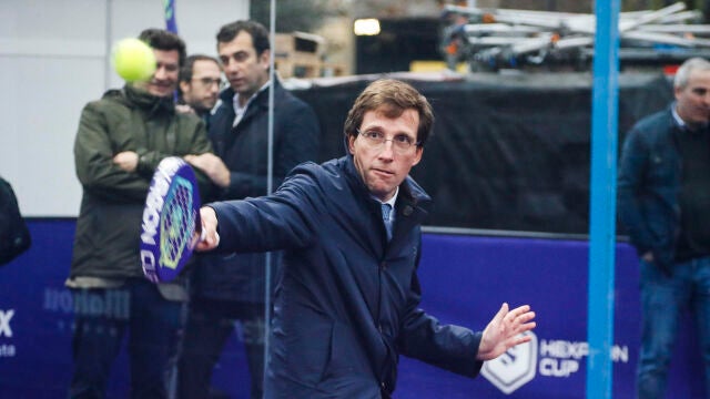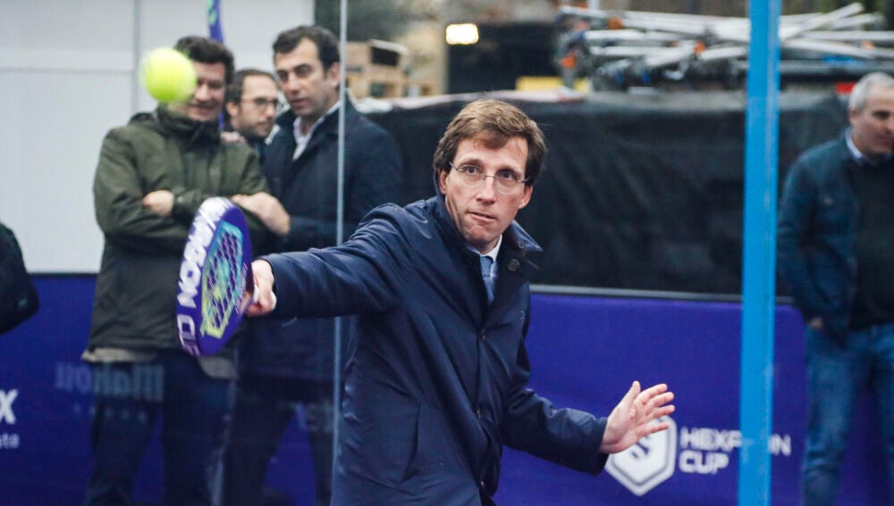 El alcalde de Madrid acude a la presentación del Hexagon Cup en la Plaza Colón... y parece que el pádel se le da mejor que el fútbol.