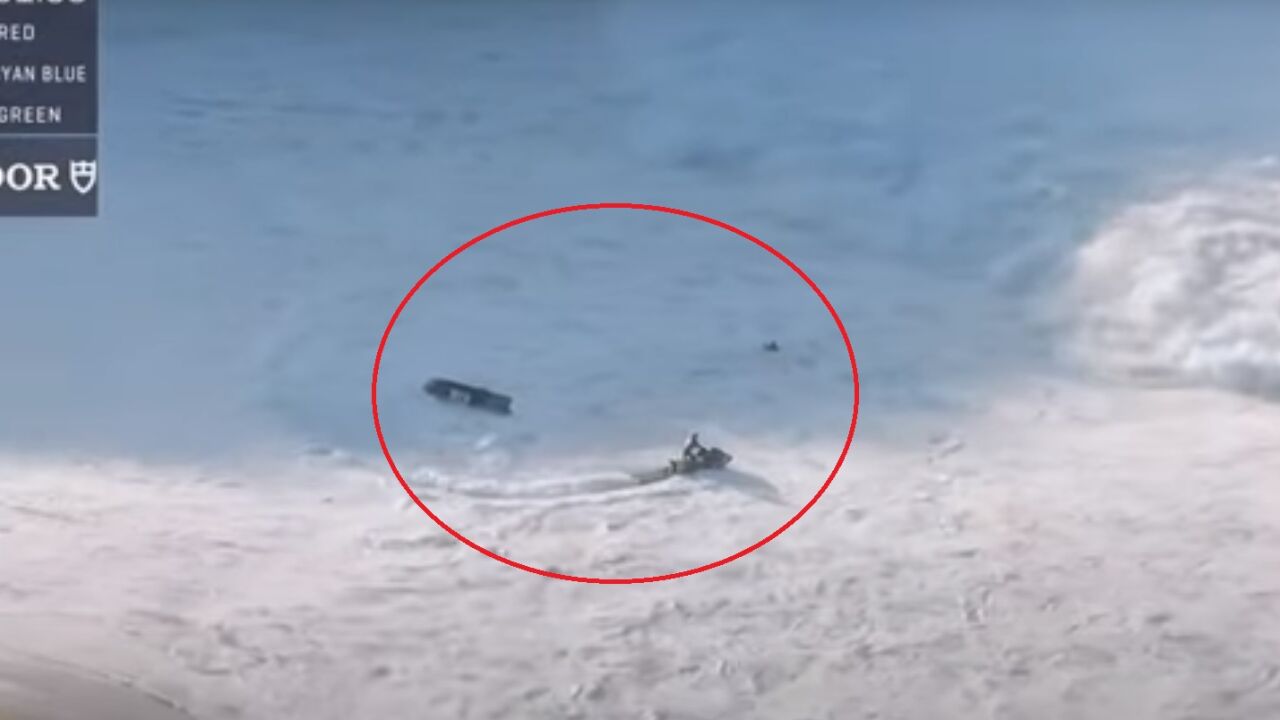 El surfista hawaiano perdió el equilibrio en una ola y acabó muy cerca de las rocas del acantilado. Lucas 'Chumbo' trató de rescatarle con la moto de agua y una enorme ola engullo a los dos. Al final, todo quedó en un tremendo susto.