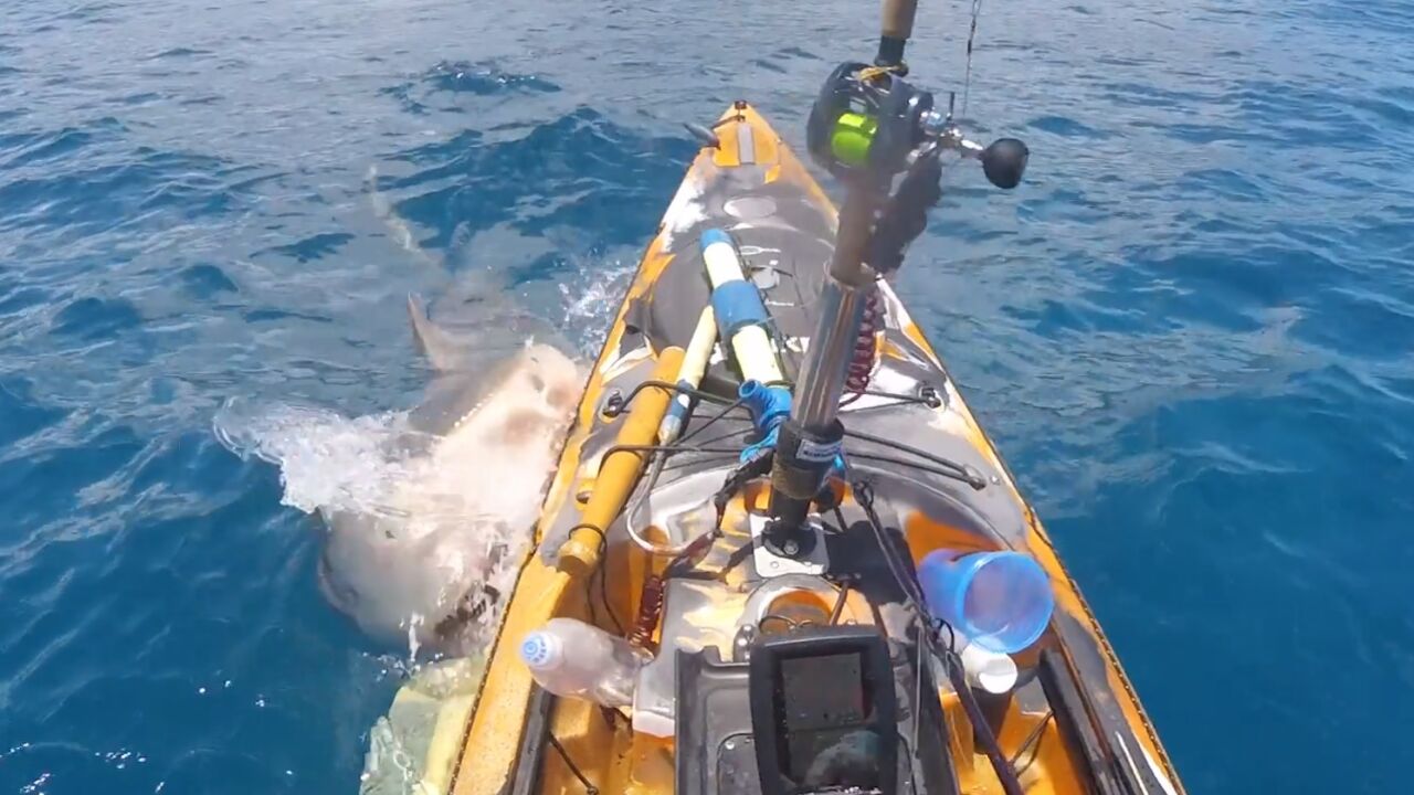 El pescador Scott Haraguchi grabó el momento en que un tiburón tigre muerde su kaya mientras pescada en Oahu, Hawái. La secuencia es aterradora.