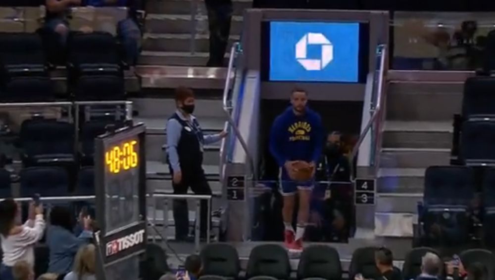 La última maravilla de Curry deja helado a cualquier persona que lo ve, en vídeo impresiona, en directo debe ser inexplicable. El base americano se ha atrevido a lanza un triple desde la grada, a unos 20 metros de canasta y escorado en la esquina. La bola, por supuesto, entra limpia.