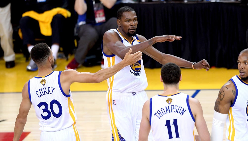 Durant, que dejó a los Thunder de Oklahoma City para conseguir su primer anillo de campeón de la NBA, se encuentra a dos triunfos más de lograrlo. Mientras que Thompson superó el bache encestador y lo hizo con cuatro triples, de los 18 que anotaron los Warriors desde fuera del perímetro en 43 intentos, además de volver a jugar una gran defensa con siete rebotes.