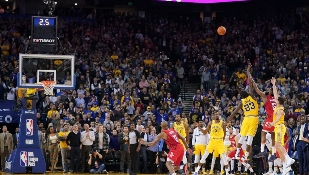 Harden logró la espectacular canasta a pesar que estaba marcado por el escolta Klay Thompson y el ala-pívot Draymond Green, quien inclusive le tocó la mano cuando hizo el triple ganador.