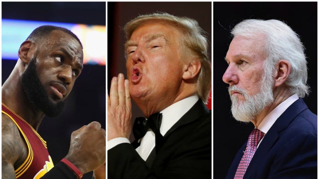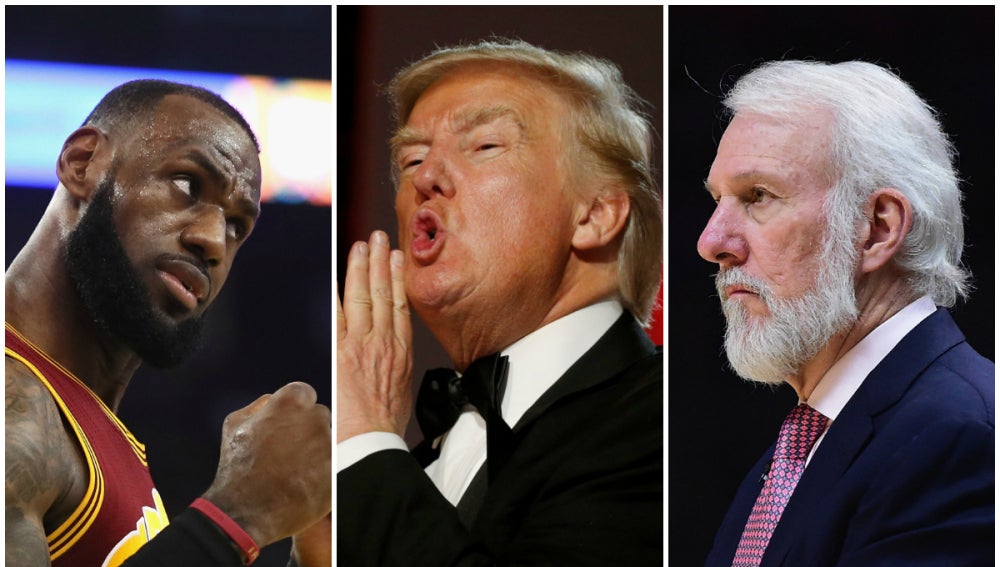 Antes de que su equipo de los Spurs de San Antonio venciesen en la prórroga 115-118 a los Cavaliers de Cleveland, el veterano entrenador Gregg Popovich volvió a criticar con dureza la figura del nuevo presidente de Estados Unidos, Donald Trump. Por su parte, el alero de los Cavaliers LeBron James, uno de los deportistas profesionales que más han alzado la voz en contra de la ideología política de Trump desde que era candidato presidencial, publicó en su cuenta de Instagram un vídeo en el que critica a Trump por utilizar una frase de la película Batman: The Dark Knight Rises.