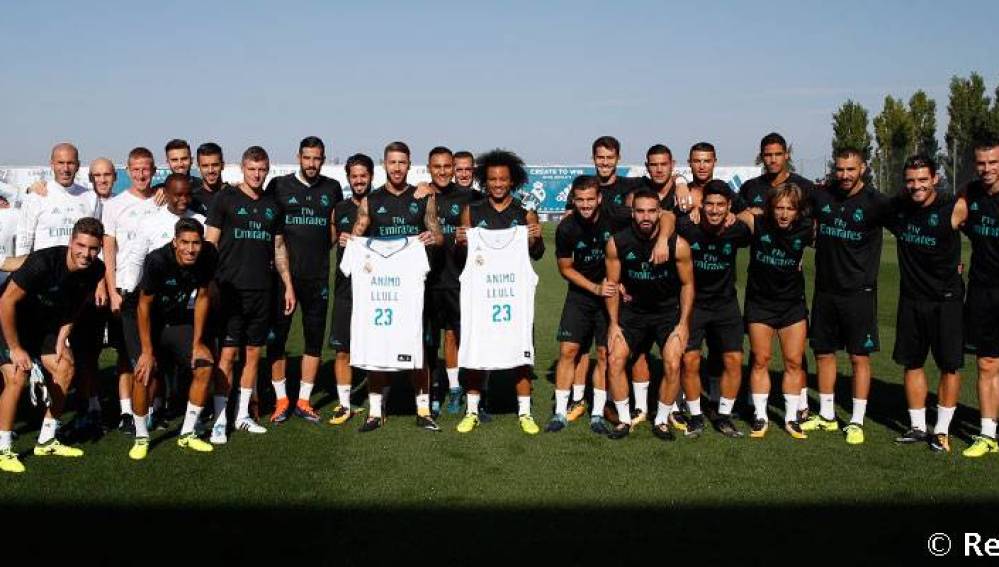 Con los capitanes Sergio Ramos y Marcelo sosteniendo dos camisetas, una de entrenamiento y otra oficial con el dorsal 23 y el mensaje "ánimo Llull", toda la plantilla madridista quiso mandar optimismo y fuerza en la recuperación al internacional español.