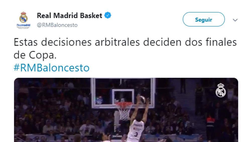 El Real Madrid expresó su indignación con la decisión arbitral en la jugada que definió a favor del Barcelona la final de la Copa del Rey, y pidió a la ACB que explique en un comunicado por qué anularon una acción que consideran "legal" ya que se sienten perjudicados por segundo año consecutivo en el torneo.