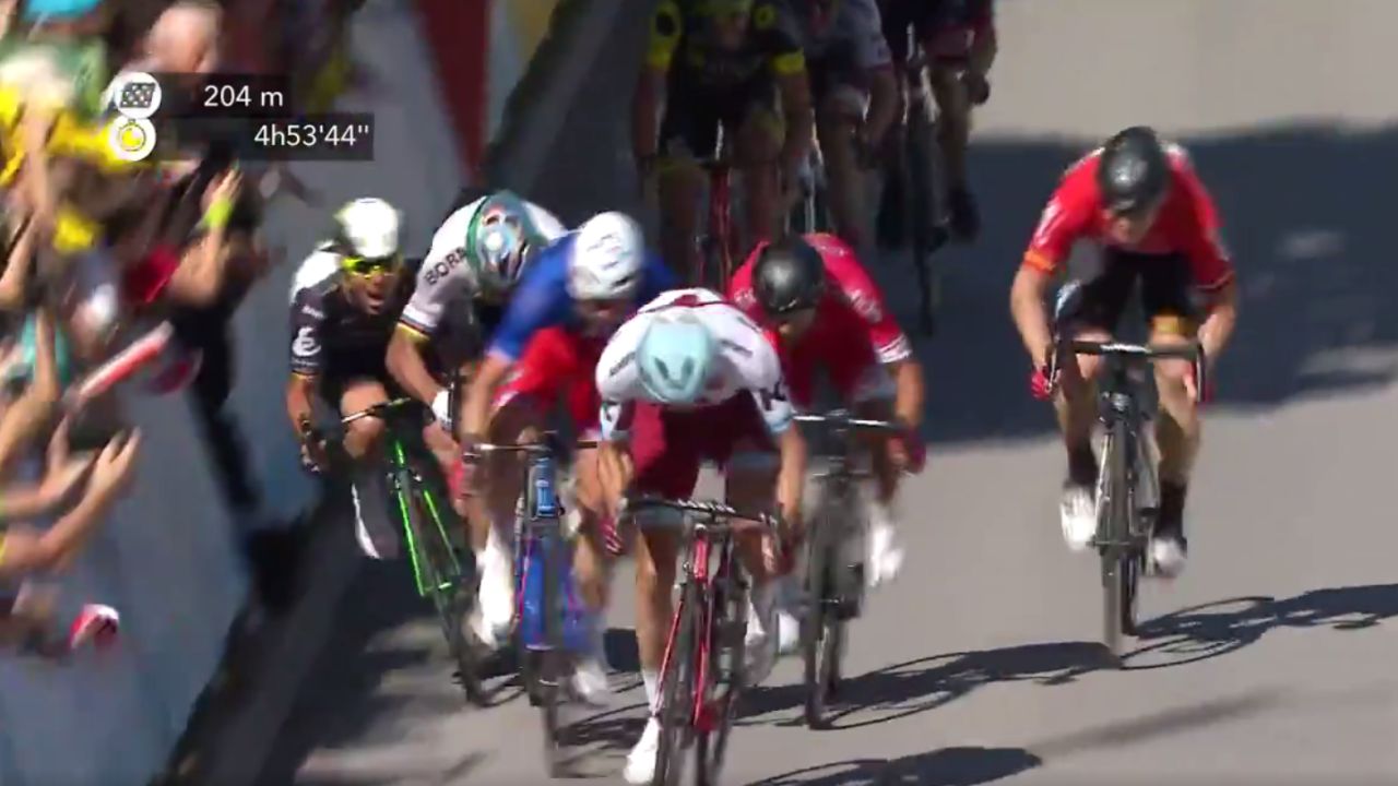 El galo fue el más rápido en el reducido grupo que llegó a disputar la victoria, muy mermado por las caídas previas. Demarre aventajó al noruego Alexandre Kristoff y al eslovaco Peter Sagan, que sacó el codo derecho en los últimos metros y derribó al británico Mark Cavendish.