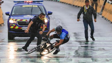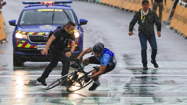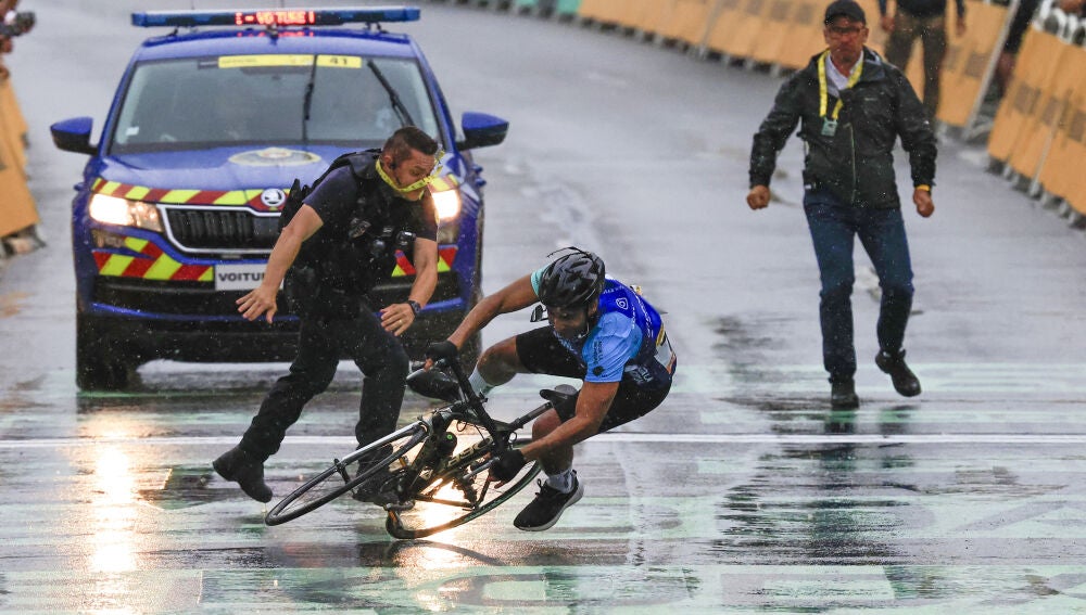 Poco antes del percance con el aficionado, las caídas fueron las protagonistas del día, y el español Carlos Rodríguez estuvo involucrado en dos, convirtiéndose en uno de los grandes lastimados en una jornada pasada por agua.