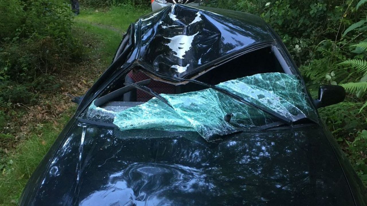 Poco después la Policía Foral ha publicado una foto del vehículo, que estaba escondido, totalmente destrozado por el impacto: "Localizado vehículo, escondido. Por respeto no publicaremos foto de la posición final de la bicicleta (en un árbol, a 10m de altura)".