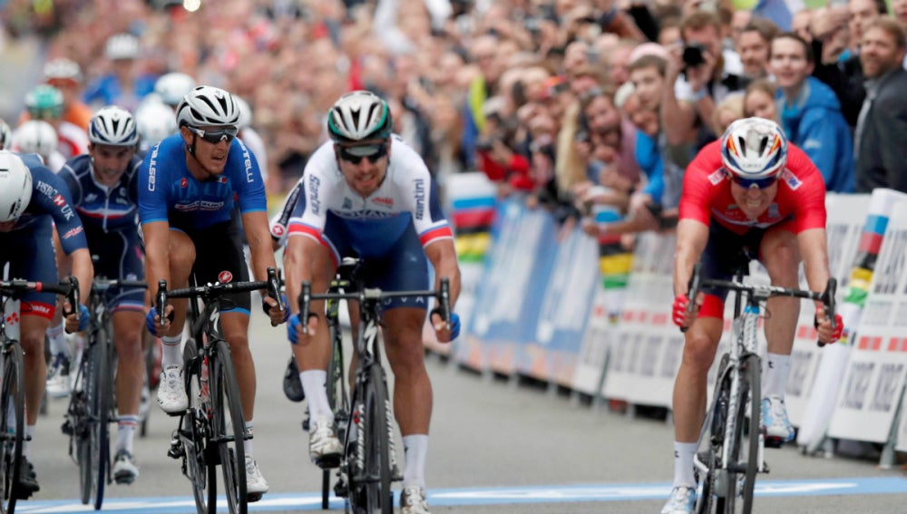 Ha lanzado el sprint Kristoff, Sagan le ha remontado y cuando parecía que el eslovaco lo tenía hecho Kritoff ha hecho un último esfuerzo que casi le vale el oro. Pero no, Sagan ha aguantado unos centímetros de ventaja para entrar en la historia como el mejor corredor de los Mundiales de Ruta de la historia.