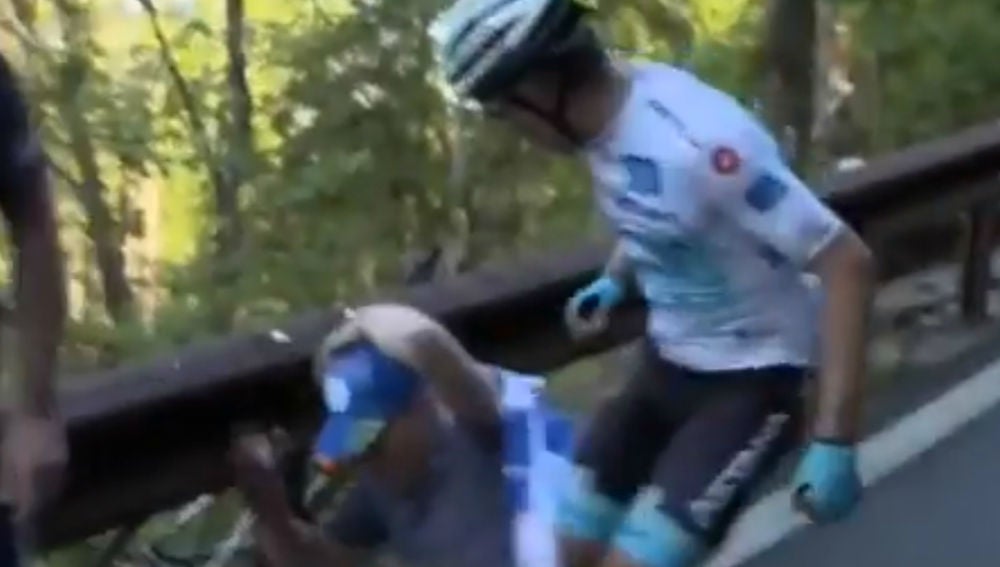Imagen pocas veces vista la que se vivió en la etapa 20 del Giro de Italia. Miguel Ángel López, del Astana, golpeó repetidas veces a un aficionado que le derribó en una bajada a pocos kilómetros del final. El colombiano perdió por dicho suceso toda opción de alcanzar la zona noble de la clasificación.