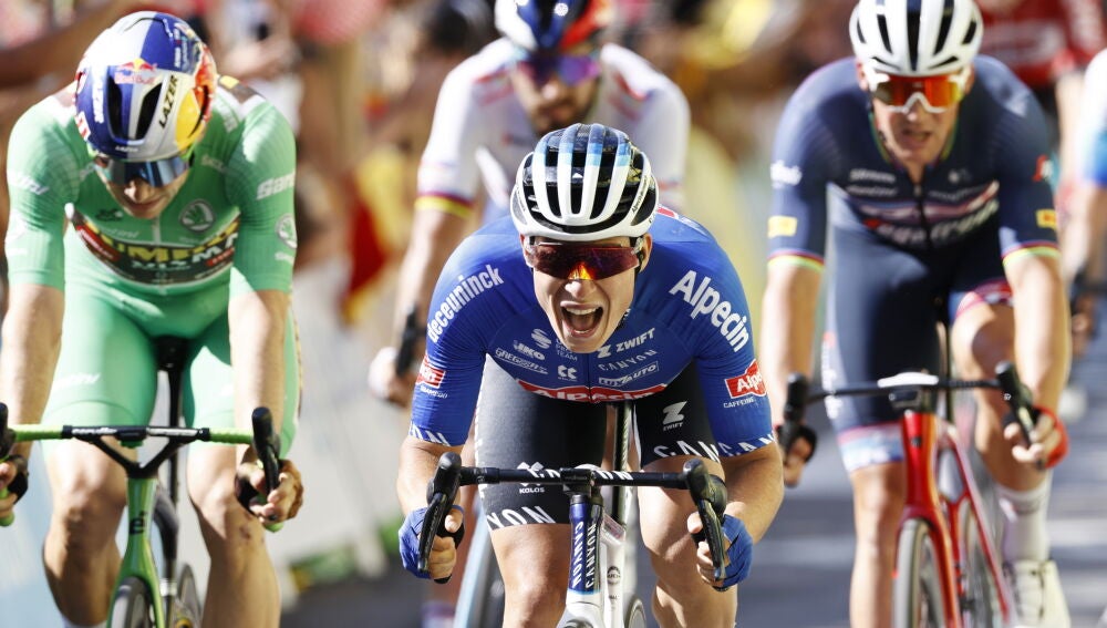 El belga se impone en un sprint duro a Van Aert en una jornada de muchas caídas y varias malas noticias para Jumbo con los abandonos de Roglic y Kruijswijk. Vingegaard, líder un día más.